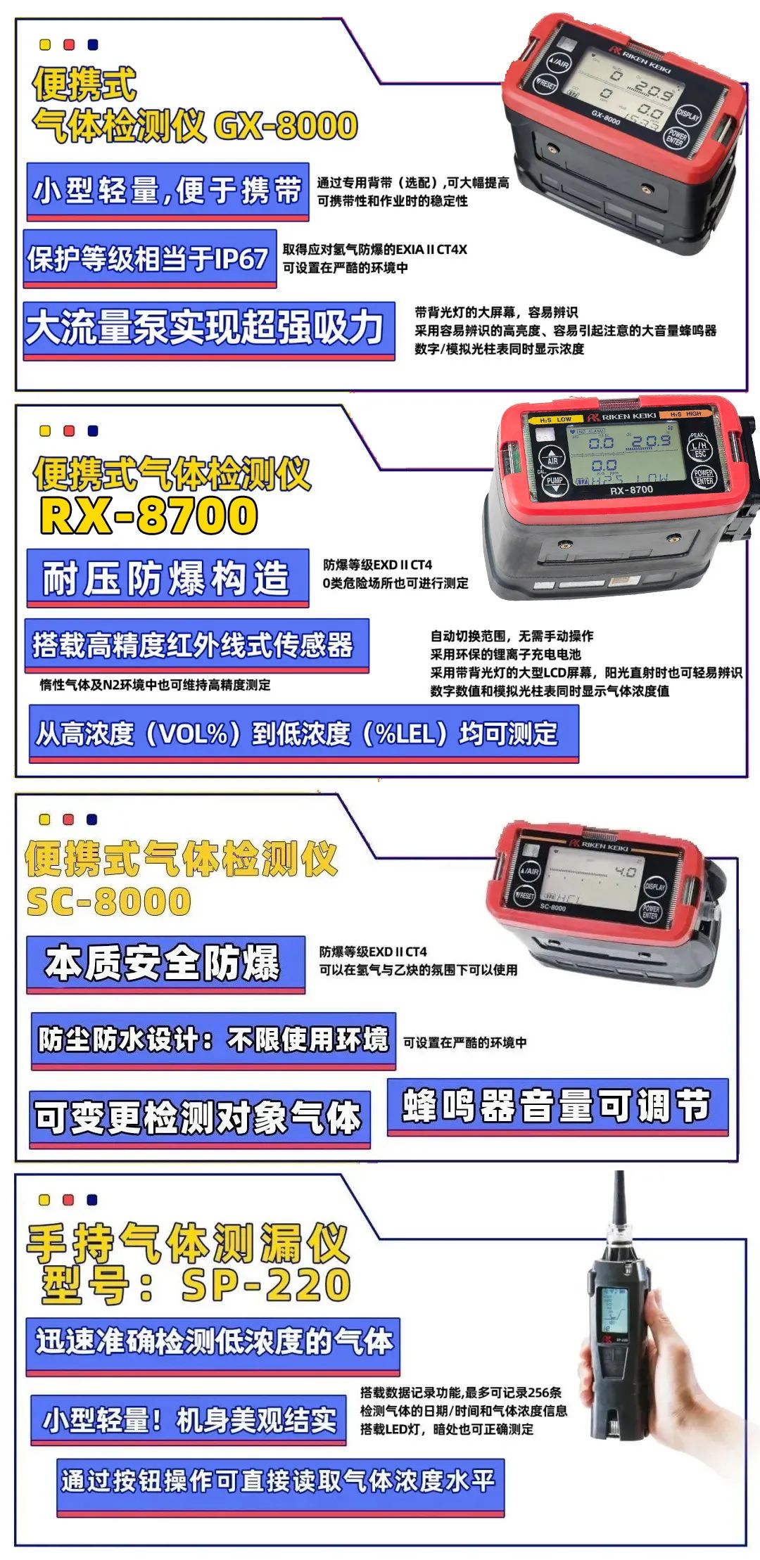 理研计器便携式气体检测仪GX-8000、RX-8700、SC-8000、SP-220、GX-6000适合各类场景作业用,不会影响作业过程,实时检测到环境内的气体含量变化。