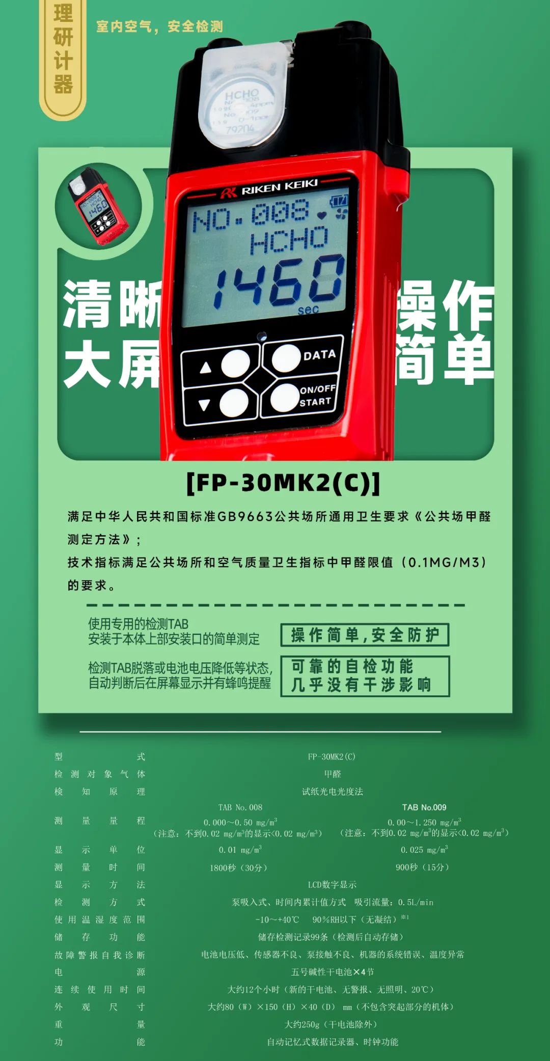 FP-30MK2(C)是理研计器株式会社专为中国室内空气中甲醛检测订制的产品,完全满足中华人民共和国标准GB9663公共场所通用卫生要求《公共场甲醛测定方法》。
